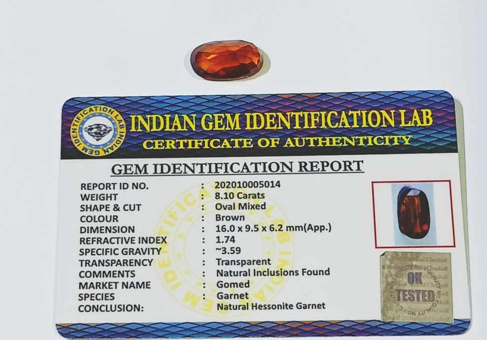 Certified Gomed (Hessonite) Stone & Mantrit (Energized) 8.25 Carat